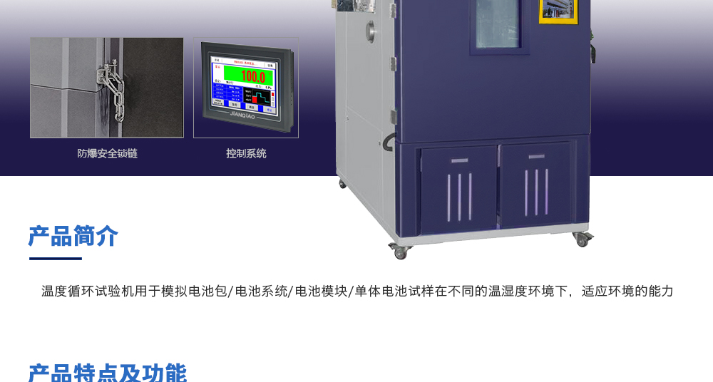 用途:溫度循環(huán)試驗機(jī)用于模擬電池包/電池系統(tǒng)/電池模塊/單體電池試樣在不同的溫濕度環(huán)境下,適應(yīng)環(huán)境的能力