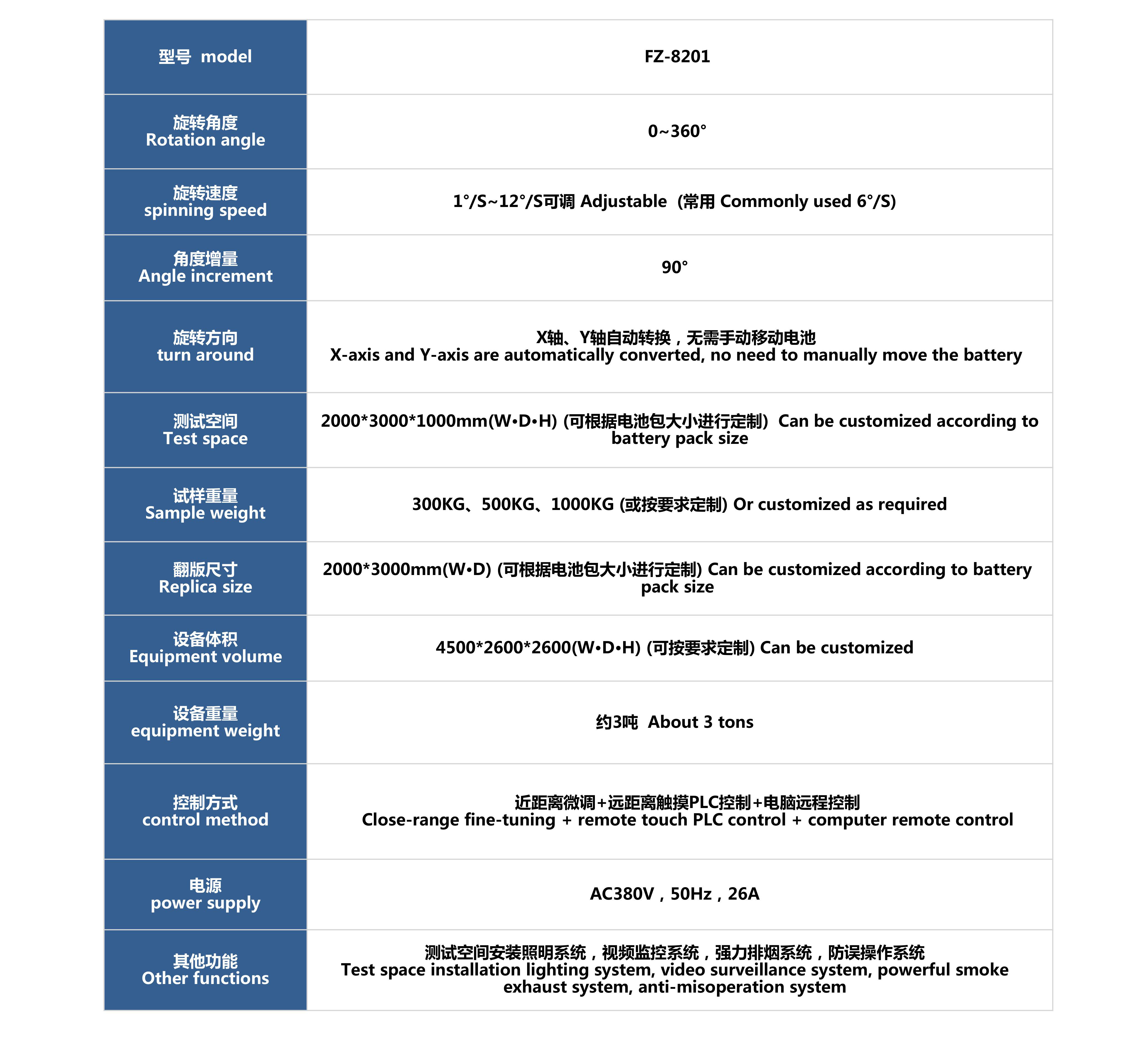 用途:電池包翻轉(zhuǎn)試驗臺是模擬電池包或系統(tǒng)安裝在電動汽車上,汽車在行駛過程中出現(xiàn)高角度上坡、下坡、側(cè)翻、翻轉(zhuǎn)等特殊情況下,觀察電池包或系統(tǒng)可能會出現(xiàn)的不同狀況。在試驗室中