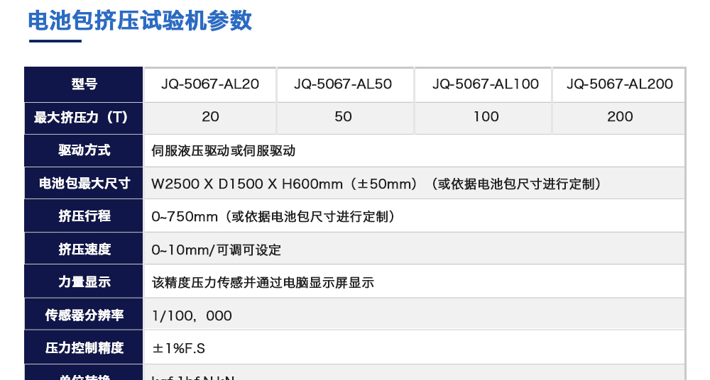 用途:電池包擠壓試驗機模擬各類動力動力電池包和系統在運輸、儲存及使用過程中電池包遭受碰撞擠壓的情形,人工呈現電池在遭受擠壓時可能出現的不同狀況。