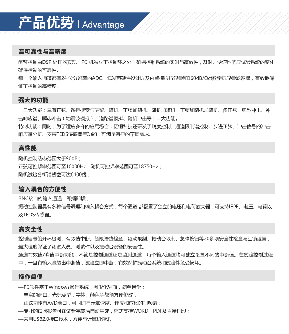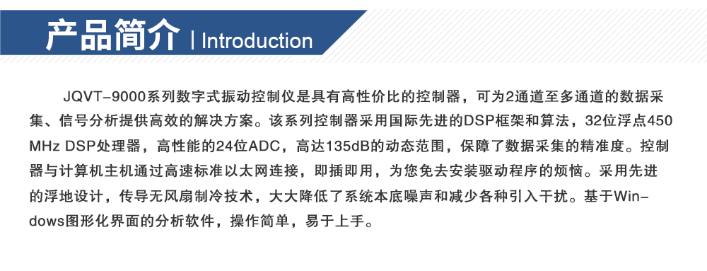 用途:JQVT-9000系列數字式振動控制儀具有高性價比的控制器,可為2通道至多通道的數據采集、信號分析提供高效的解決方案。該系列控制器采用國際先進的DSP框架和算法,32位浮點450 MHz DSP處理器,
